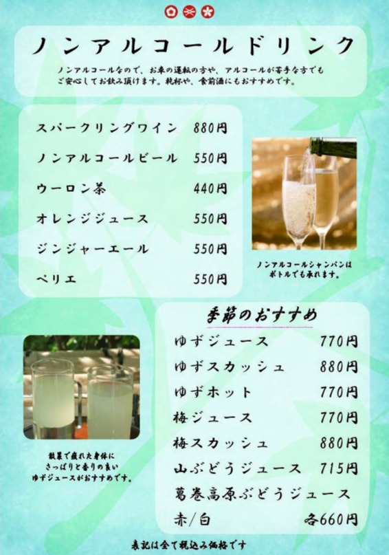 ドリンクメニューのご案内 【ノンアルコールドリンク】 【アルコールドリンク】 【飲み放題メニュー】 2000円〜/1人 各種ご用意がございます。お問合せ下さい。 ※個室ご利用で、飲み放題ご利用の場合は別途で個室料10%、サービス料10%がかかります。