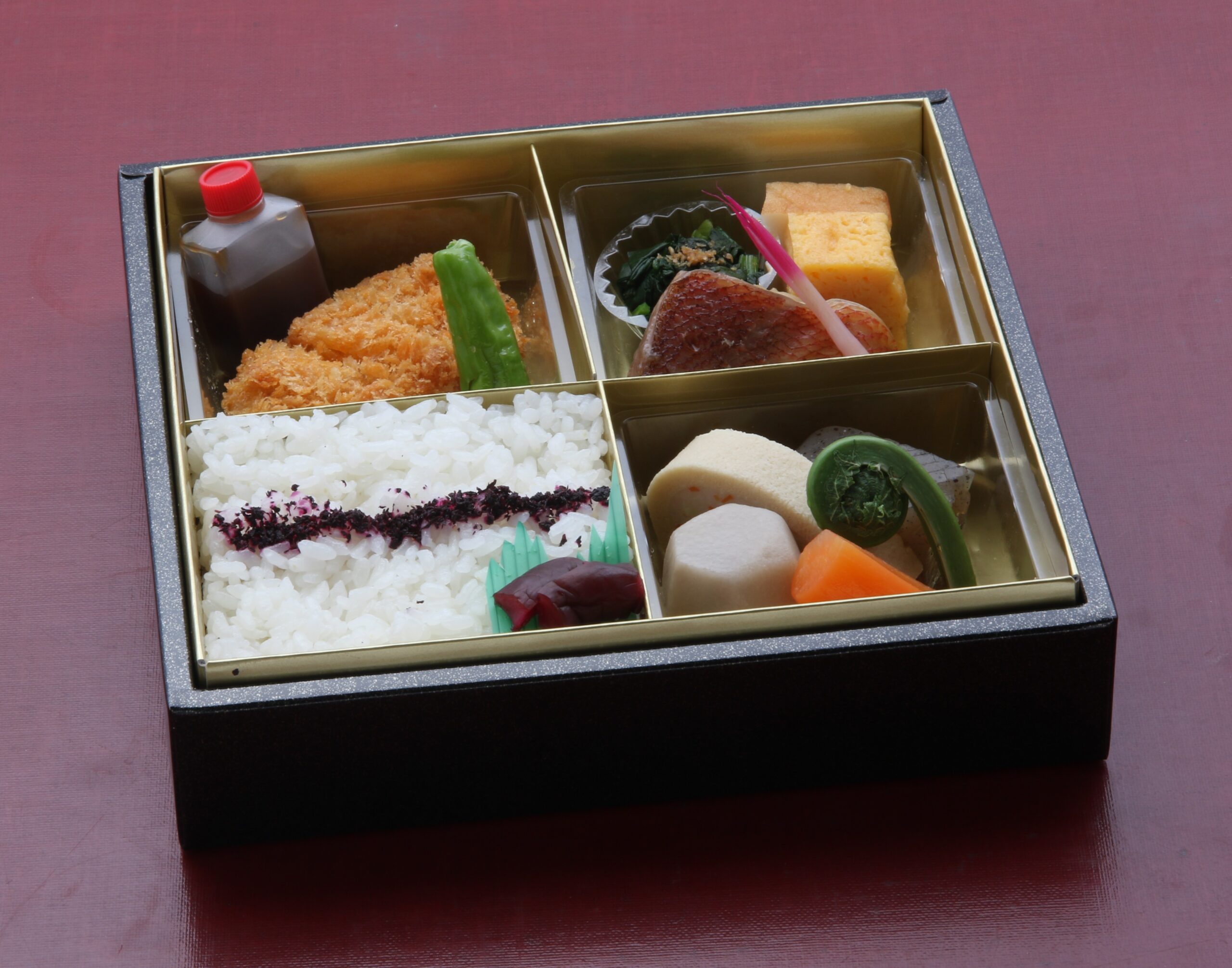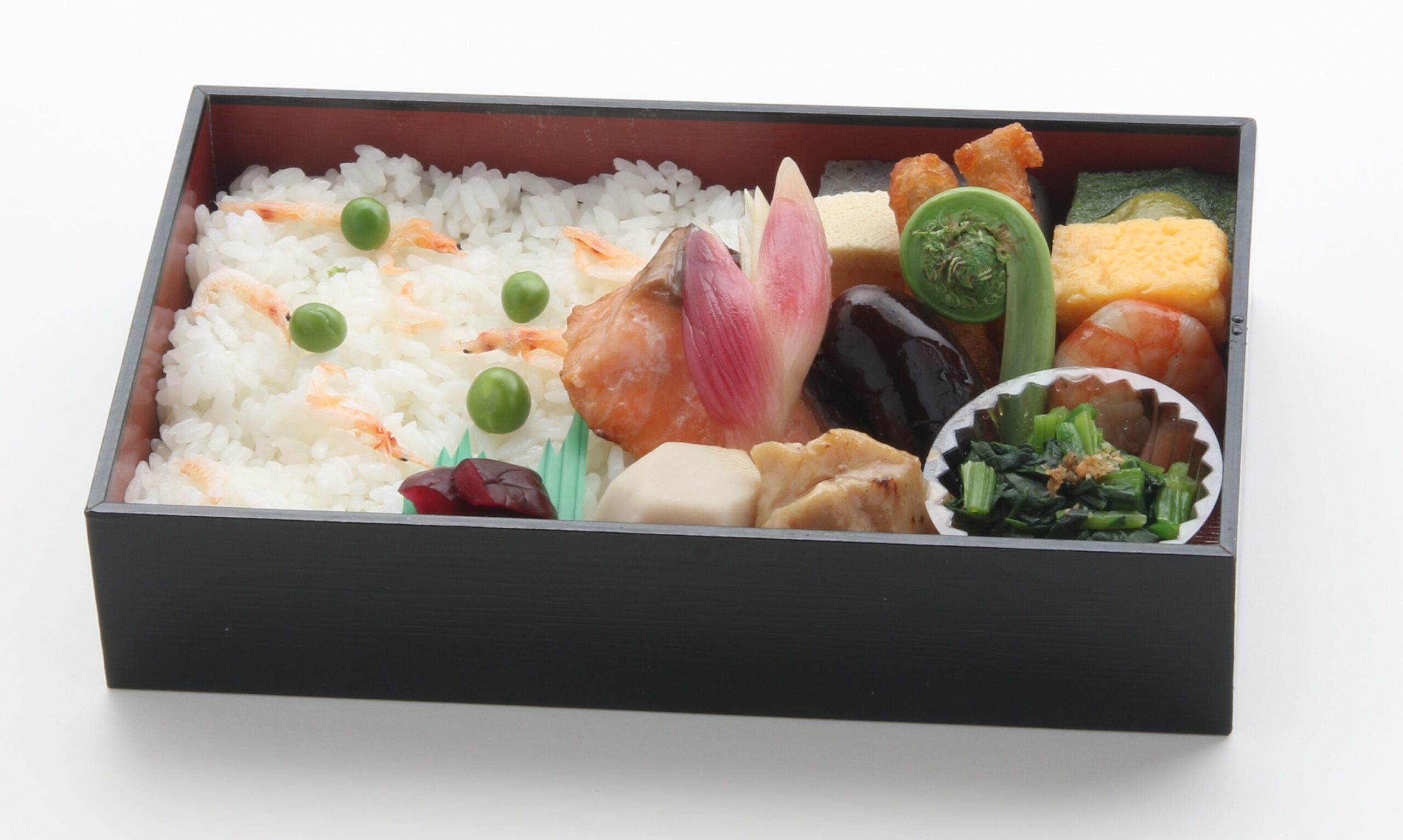 エビフライ・鶏唐揚げ・ミートボール・ポテトサラダ・ウィンナー・玉子焼・ブロッコリー・里芋・プチゼリー・俵ご飯