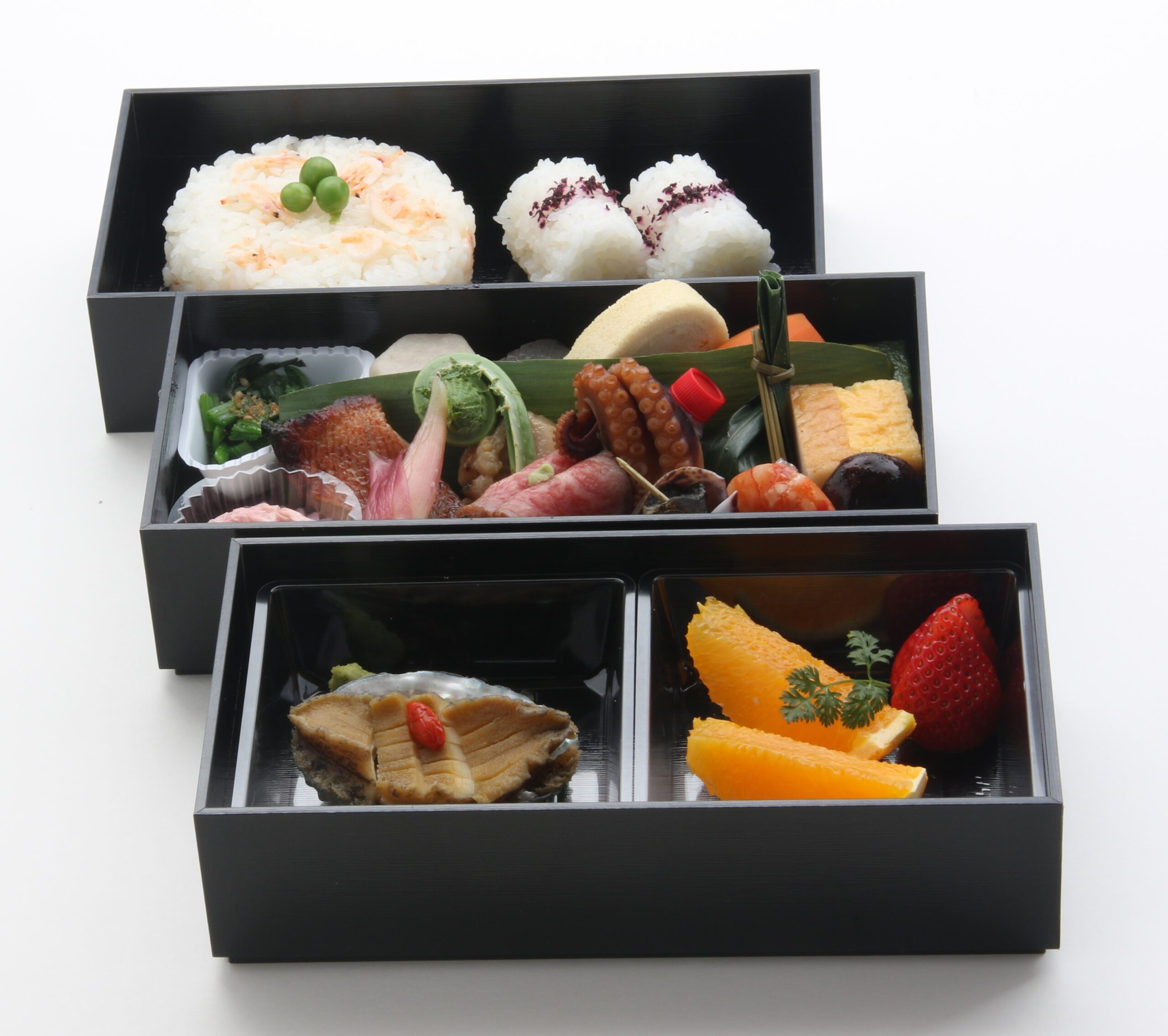 贅沢会席二段弁当に、煮鮑と季節のフルーツをプラスしました。
